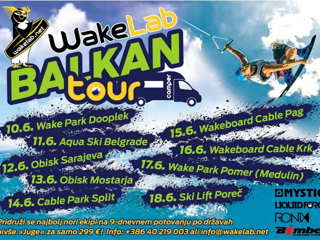 Vse ostale vezi in deske Liquid Force boste imeli priložnost preizkusiti v času WAKE LAB BALKAN TOUR-a 2017, ki ga organiziramo med 10. in 18. 6. 2017. Z avtodomom bomo obiskali bomo kar 7 wake parkov - vse od Doopleka pa do Beograda. Največja novost letošnjega Wake Lab-ovega Balkan Tour-a pa je, da ste del najbolj nore »wejkarske« ekipe lahko tudi vi. Ja, prav ste slišali … Vabimo vas, da se nam pridružite na 9-dnevnem potovanju po državah bivše »Juge«. Več si lahko preberite tukaj.